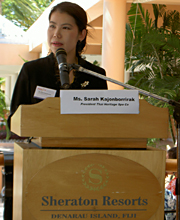 | At the 2nd Annual IHRSA Asia-Pacific Forum on September 26, 2003. Sarah is one of the guest speakers in the session of "Current Trends in Spa Industry". She is the only Thai lecturer at the Forum organized by International Health, Racquet and Sportsclub Association. | ||||
